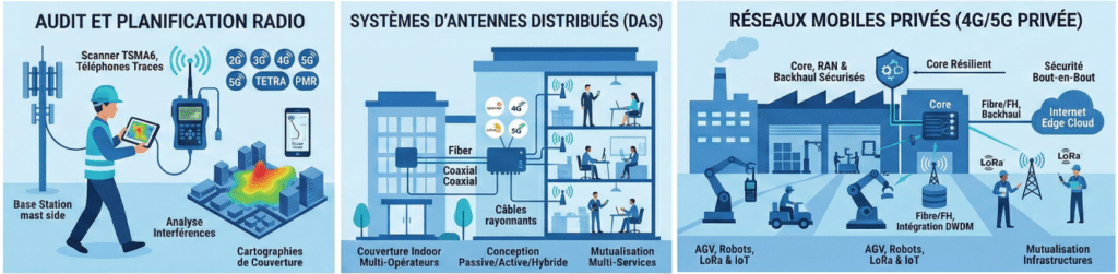 - Dimensionnement et intégration de solutions : DAS, picocellules, small cells, relais PMR, Radio Units (RU).